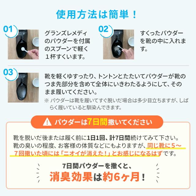 パウダーをスプーンに取り、ぱらぱらと靴の中に散布。 7〜10日間毎日散布したあとは、その後何も手を加えなくても6ヶ月以上も効果が持続します。
