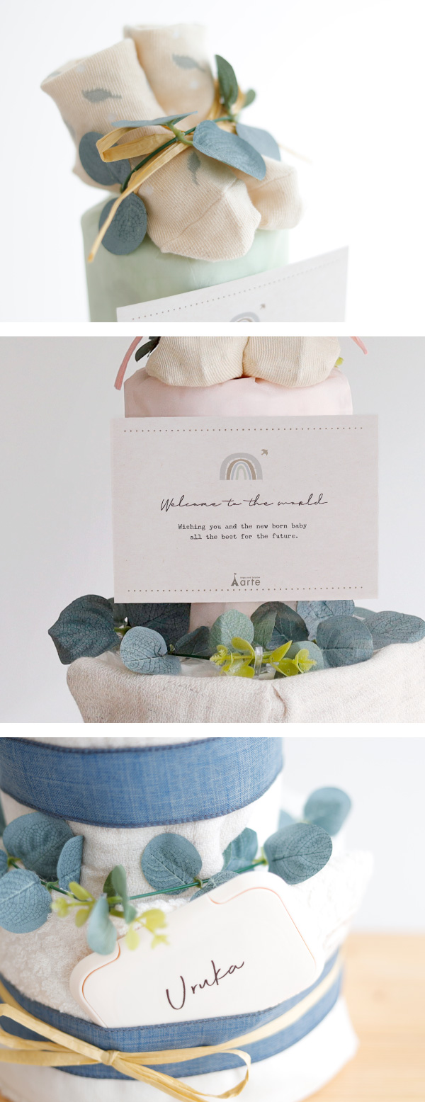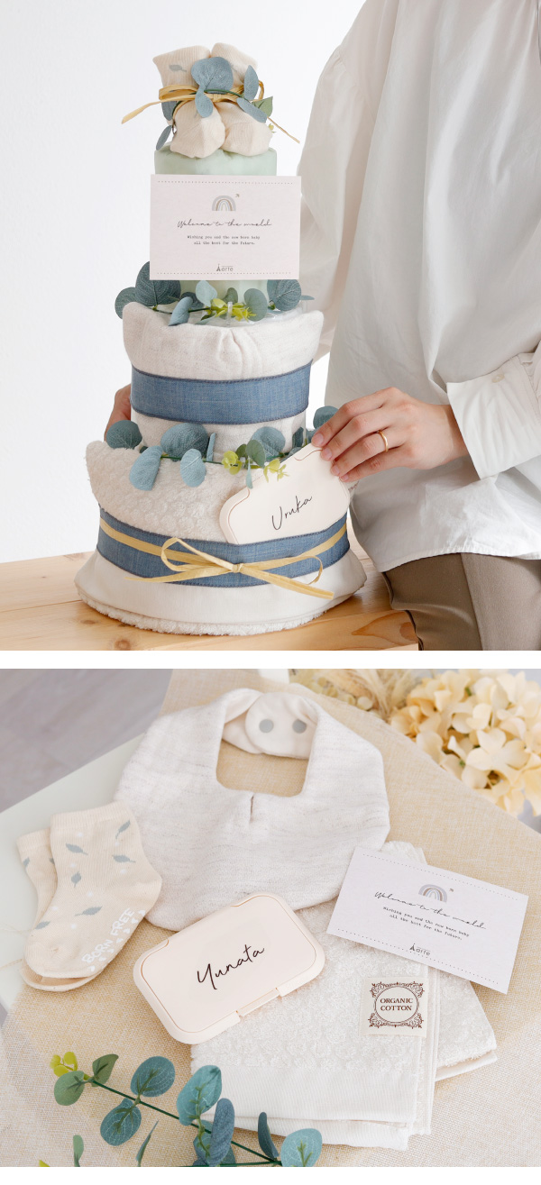 オーガニックにこだわっておむつもオーガニック素材を使用した赤ちゃんに安心安全なおむつケーキ。やさしい気持ちになれるおむつケーキです。