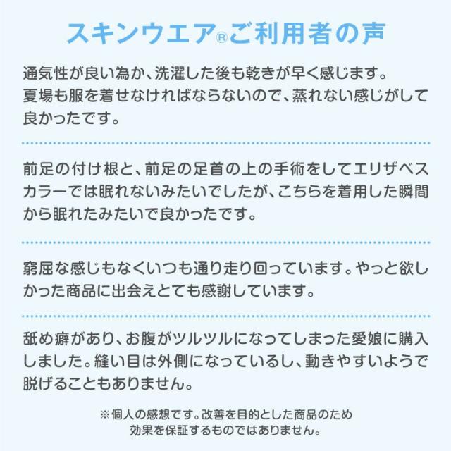 しかし、手術後の傷口を舐めるのを防いだり、皮膚トラブルや介護の際には、服が治癒を助けて生活を快適にします。