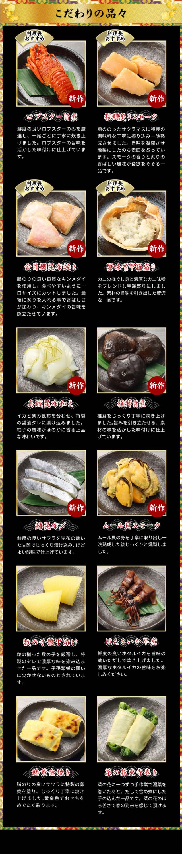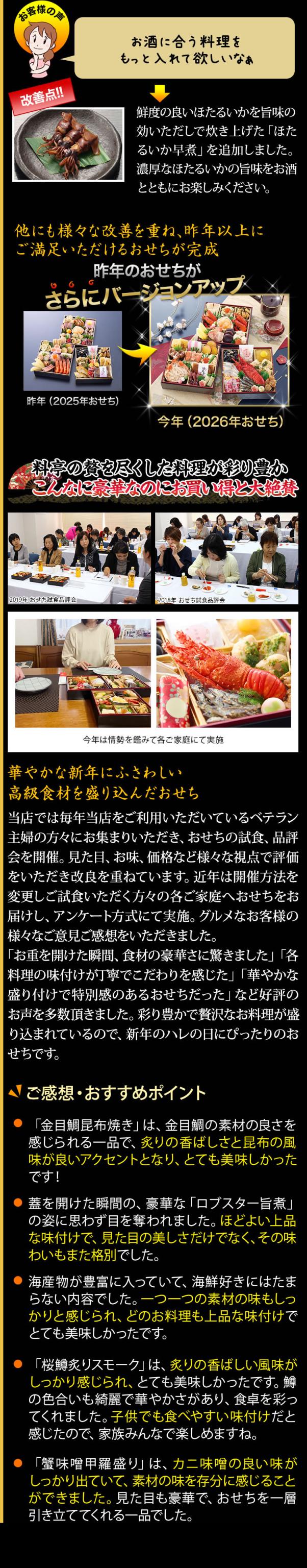 - 盛り付けがキレイ。食べるのがもったいないくらい。種類もバラエティーで楽しくいただきました。味付けもちょうど良い塩梅で我が家では大好評です。濃すぎず薄すぎず出汁を感じながら。今年一年、美味しい物に巡り会...