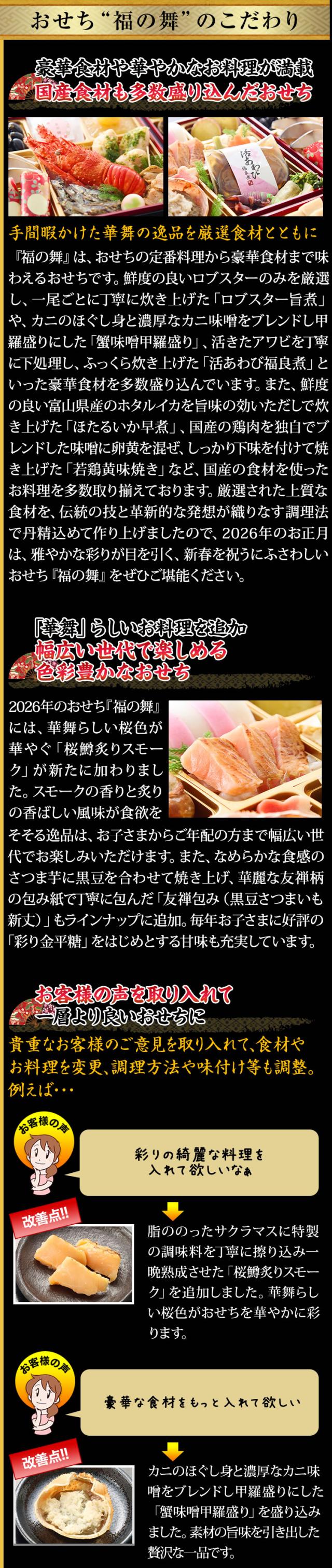 祇園華舞らしい桜色の華やかな彩りが美しい「福の舞」は厳選した料理を全41品盛り付けました。定番料理の黒豆やエビ、数の子などはもちろん、リーズナブルなお値段でありながらアワビや帆立、蟹といった高級食材も入った豪華な仕上がりとなっています。