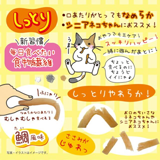 鯛風味付きで食物繊維約10%。 ささみがじゅわっ〜口あたりがとってもなめらかで、シニアネコちゃんにおススメの毛玉ケアスナックです。 給与量 1〜3.5kg位:2〜6g 3.5〜5kg位:6〜8g