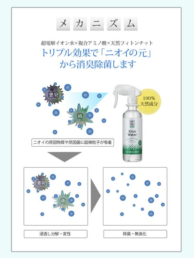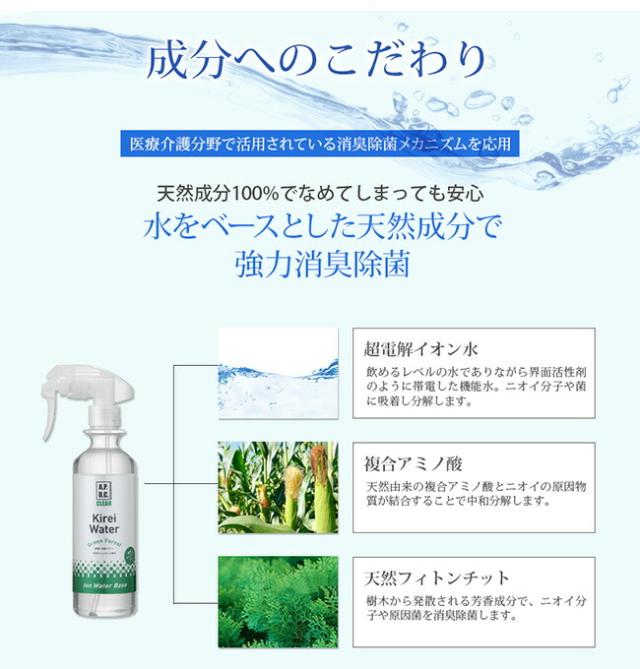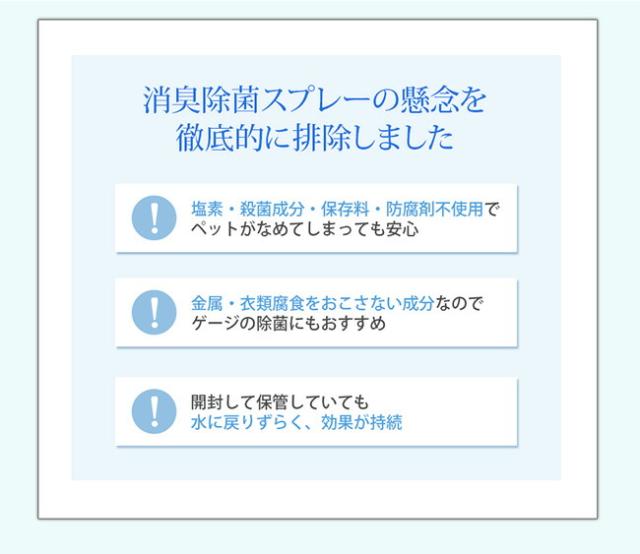 ・水から生まれた消臭除菌スプレー ・医療介護分野で使われている消臭除菌技術 ・犬、猫、小動物の身体から部屋などの空間まで丸ごと消臭除菌 ・超電解水、複合アミノ酸、天然フィトンチッドのトリプル効果でニオイ戻り無し ・リラックスするグリーンフォレストの香り
