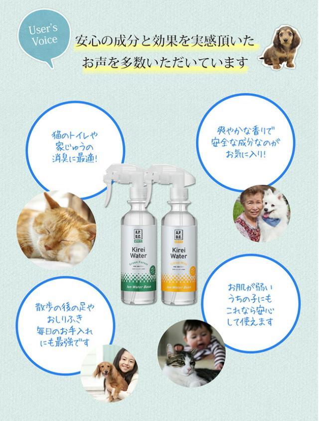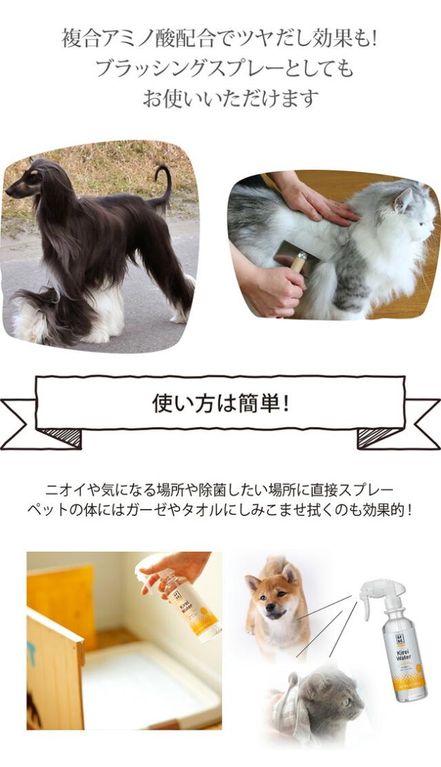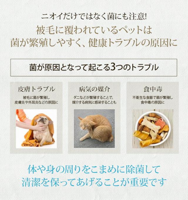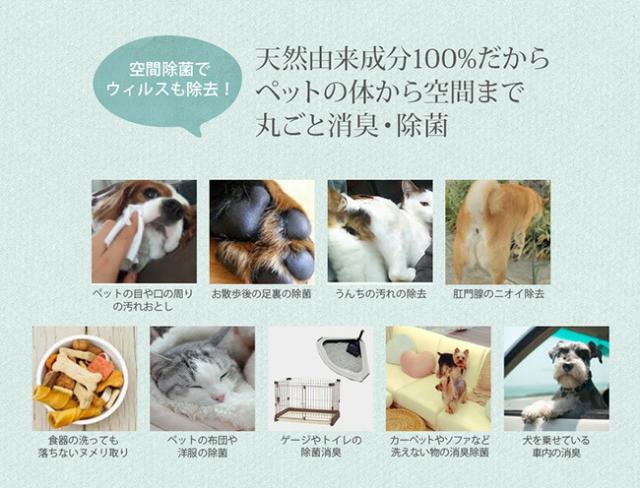 ペットのゲージ、ベッド、トイレ、カーペット、車の中など、臭いや汚れが気になる部分に。 医療介護分野の技術を応用し、水に限りなく近い成分でありながら99.9%除菌効果を実証しています。 合成化学成分不使用で、空間だけではなく、散歩後の手足の汚れ、口まわりや耳、目ヤニ・涙ヤケ対策、おしり回りなど、全身のお手入れにも。複合アミノ酸の働きで毛ヅヤをUPさせるので、ブラッシング時にもお使いいただけます。