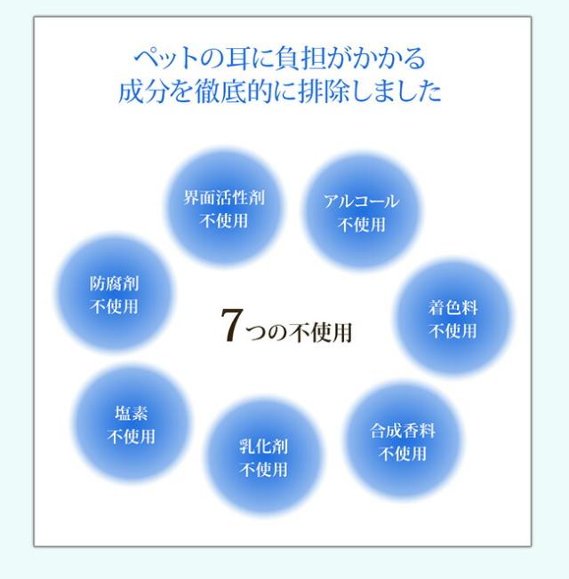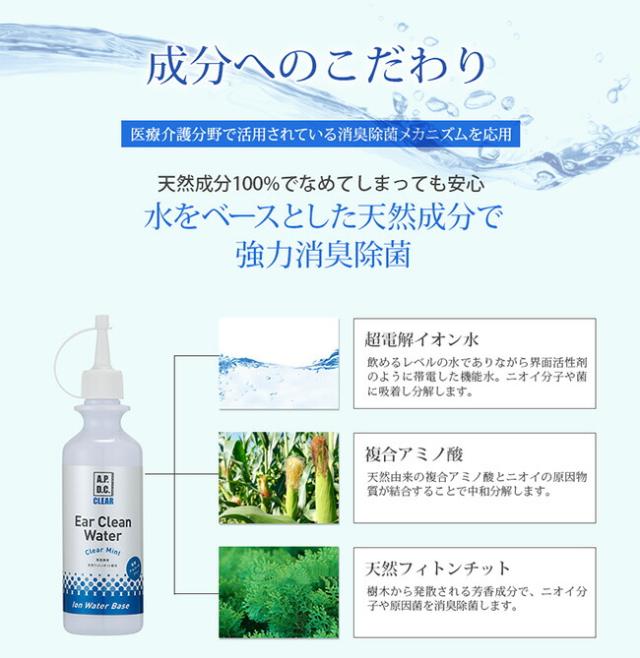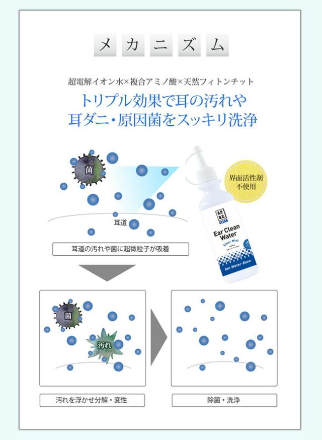 ・水から生まれた耳クリーナー ・医療介護分野で使われている消臭除菌技術 ・水ベースの安心成分 ・ノンアルコールでしみない ・ベタつかずスッキリ清潔 ・確かな洗浄効果 ・界面活性剤、防腐剤不使用