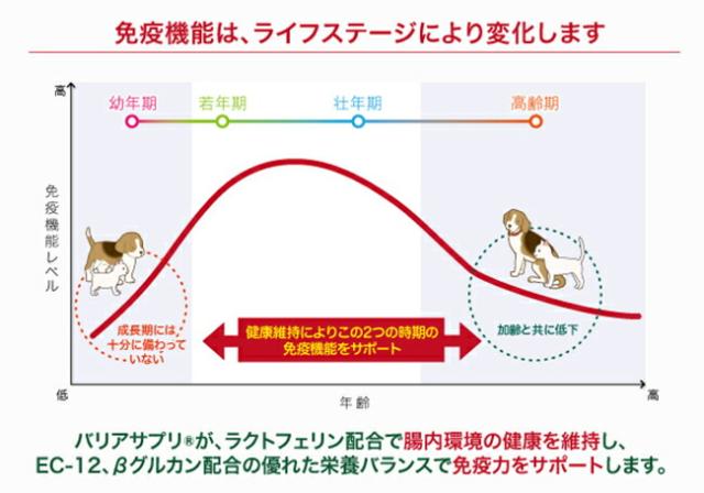 犬や猫の免疫機能は、ライフステージにより変化します。バリアサプリ®に含まれるラクトフェリンが、腸内環境の健康を維持し、EC-12、βグルカン配合の優れた栄養バランスで、幼少期の未熟な免疫力、高齢期の加齢とともに低下する免疫力のサポートが期待できます。 *幼犬幼猫やシニア犬・猫の免疫と腸内環境に配慮したサプリメントです。