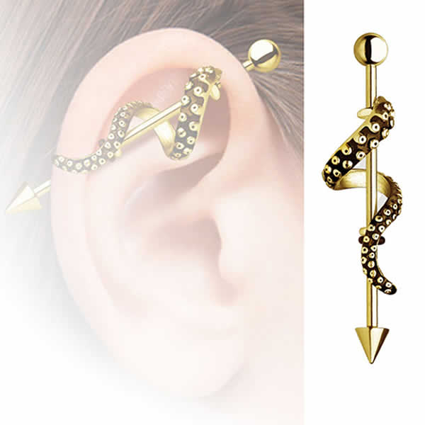 14Gの長いストレートバーベルにタコの足が絡みつく面白いインダストリアル用ボディーピアス。片側がコーンパーツで片側がボールキャッチってのもオモシロ。蛸の足のパーツは取り外しができるので、16Gのロングバーベルに付け替えたりしてもいい。メンズでもレディースでも使えるボディーピアスはペアで愛用しても。ユニークでおもしろな軟骨ボディピアスです。