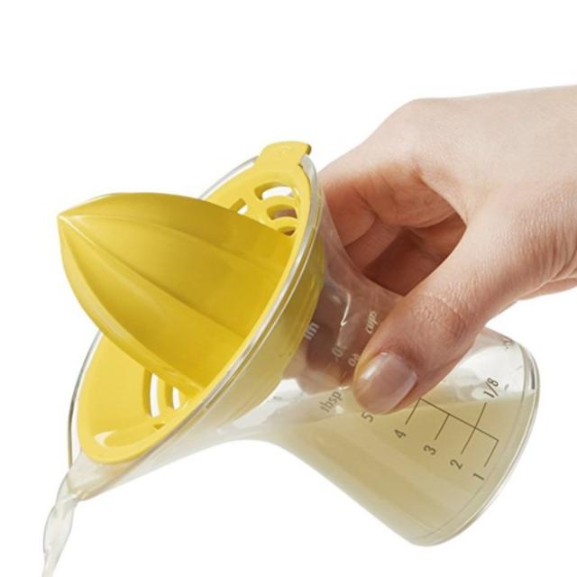 スリムなデザインなので片手で持ちやすく、搾った後すぐ果汁を注げます。目盛りで分量を確認しながら注ぐこともできるのでとっても便利です。