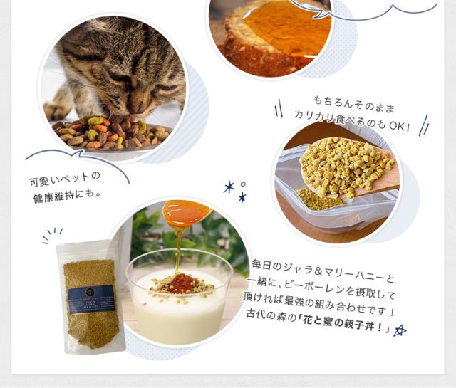 ・単一種の花からのみ採取しているため、色が均一です。一般のビーポーレンでいろいろな異なる色のものが混ざっているものは、間違いなく複数の花のものが混ざっています。