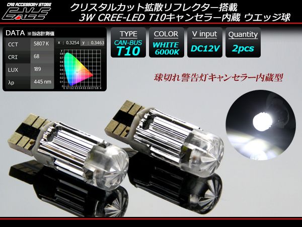 T10 LED バルブ CREE 3W 拡散型 キャンセラー内蔵 ホワイト 2個セット E-105