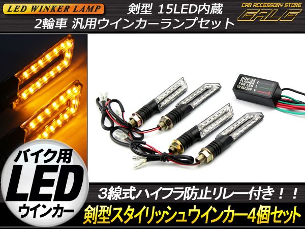 汎用 2輪車 剣型LEDウインカー 4個セット&3線式リレー 照度の高い5050SMDを15個内蔵した剣型の汎用ウインカー ウインカー4個+3線式ハイフラ防止リレーのセットです。 他にもウインカーを多種類販売中!!※輸入品のため、防水処理が甘めです。 必要に応じて防水処理後の取付けをお勧めします。商品内容 ■ 剣型ウインカー・リレーセット ■ 12V専用 ■ 発光色:アンバー ■ セット内容:ウインカー4個+リレー ■ 3線式リレー MAX240W(カチカチ音なし)