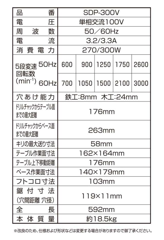 | ・電源:単相交流100V・電流3.2/3.3A ・消費電力:270/300W ・無負荷回転数:700-3000/600-2600(60Hz/50Hz) ・穴あけ能力:鉄工8mm・木工24mm ・キリの最大送り寸法:50mm・フトコロ寸法103mm ・テーブル上下移動距離:176mm・テーブル作業面:162X164mm・ベースーチャック間最大距離:270mm ・チャック:13mm・取付軸:ジャコブステーパーJT33 ・全高さ:592mm・本体質量:18.5kg |