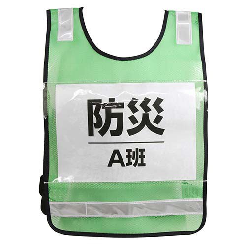 | サイズ:着丈54cm・肩幅35cm・胴回り90〜130cm。色:グリーン。反射テープ色:白。(材質)ウエア:ポリエステル。テープ:ポリ塩化ビニール。 |