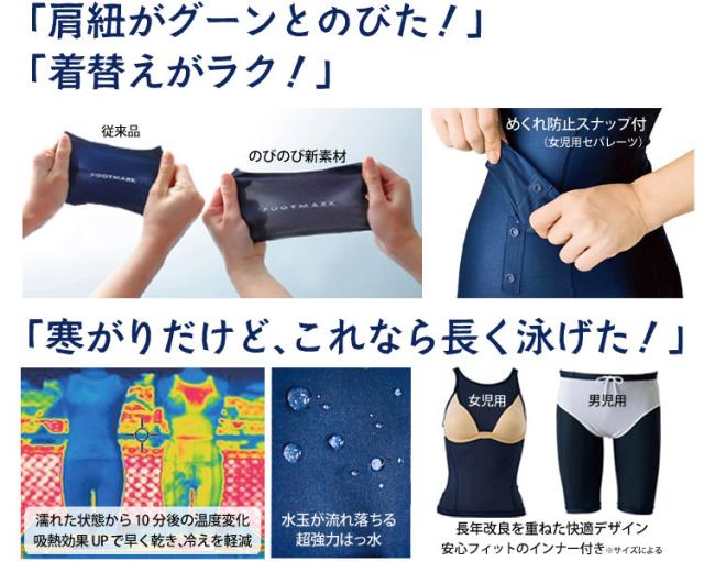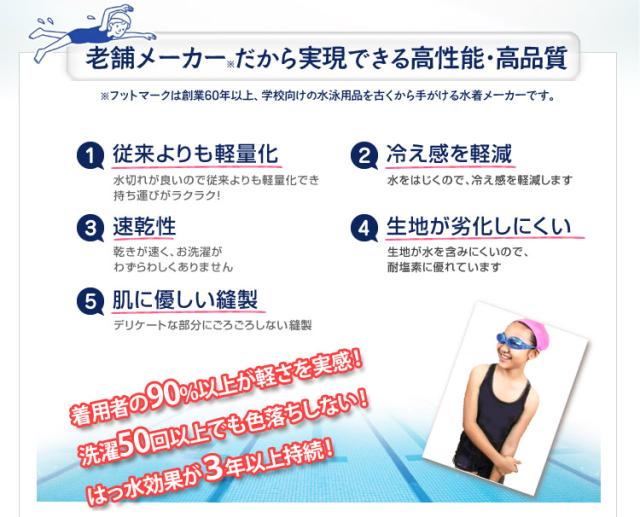 シンプルで着やすい フットマーク スクール水着 女子 ジュニア水着。撥水・速乾に優れた、高性能の子供水着です。