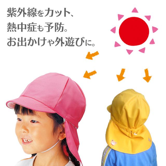 色落ちしにくく乾きやすいポリエステル100%。サイズ:幼児フリー(53cm〜58cm)/つば4.5cm/フラップ15cm