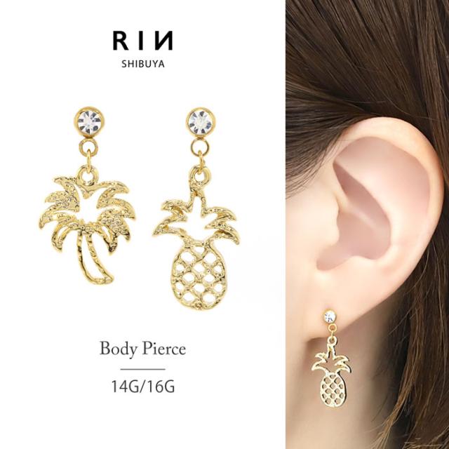 ボディピアス 14G 16G 軟骨 ピアス ヤシの木 パイナップル 南国 トロピカル パーム フルーツ ボディーピアス ハワイアン チャーム付き 揺れる ゴールド 凛