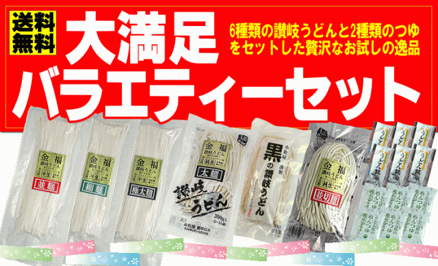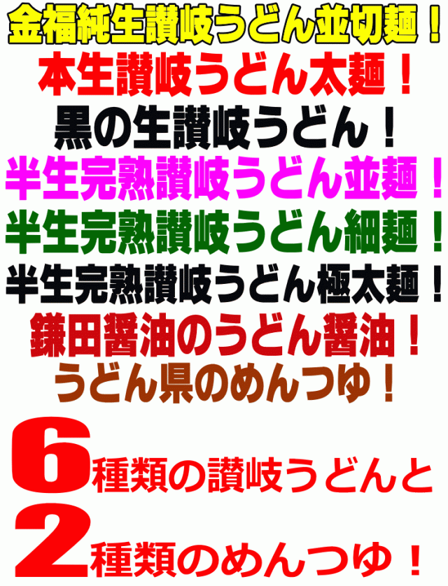 ■商品内容:以下各1袋ずつ合計6袋(完熟讃岐うどん極太麺250g、同並麺250g、同細麺250g、生太麺300g、金福純生並切麺250g、黒の生麺300g)、鎌田醤油製うどん醤油20ml×6袋、堺屋醤油うどん県めんつゆ20ml×6袋■賞味期限(全て常温):各半生讃岐うどん45日、各生讃岐うどん35日、黒の生讃岐うどん20日、各めんつゆ約11ヶ月■送料:日本国内全国送料無料■のし包装:無料