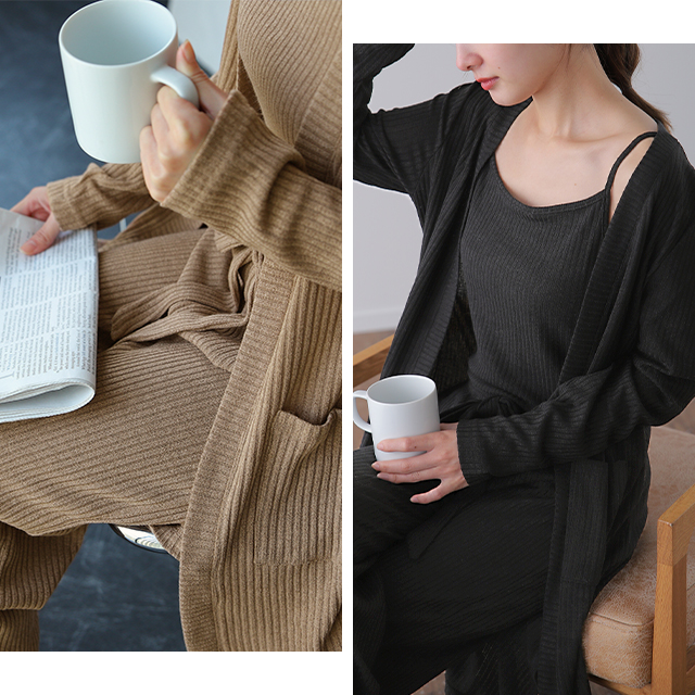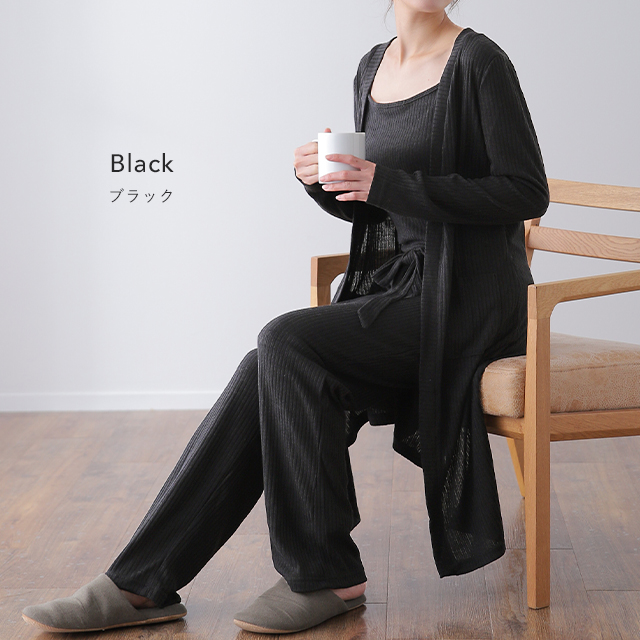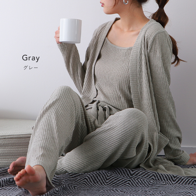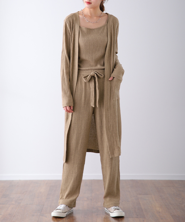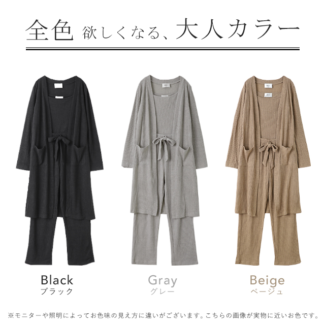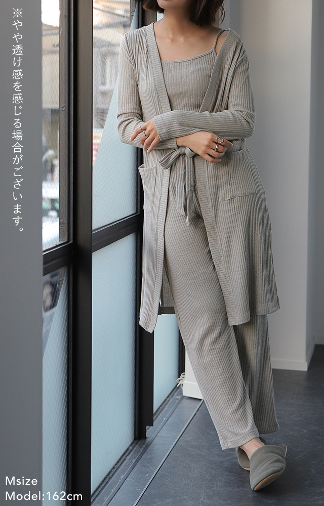 ルームウェア セットアップ 3点セット カーディガン キャミソール パンツ ロングカーディガン カーデ HS レディース 大きいサイズ プラスサイズ キャミ 部屋着 パジャマ 彼モテ S M L XL 2XL LL 2L 3L 黒 灰色 グレー キャメル ベージュ ブラック 母の日