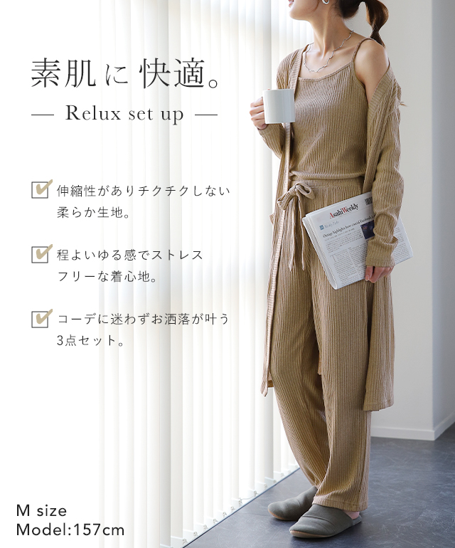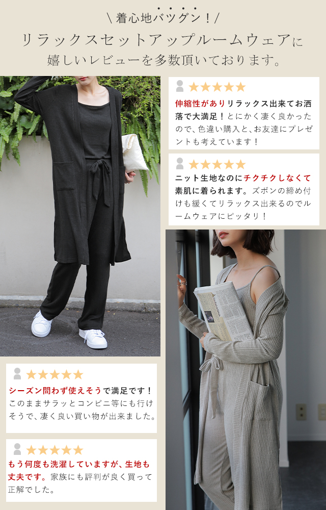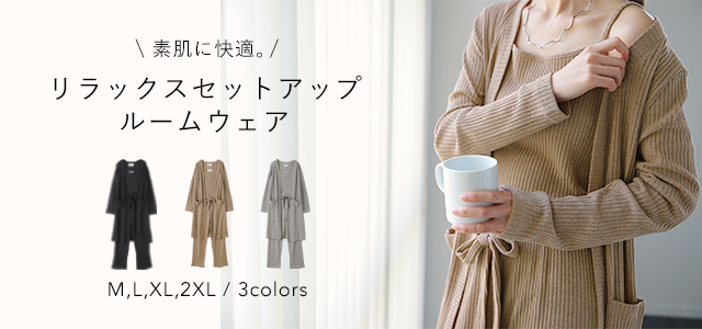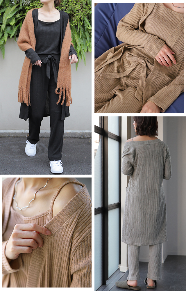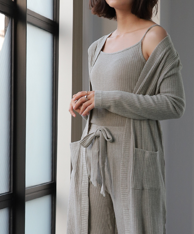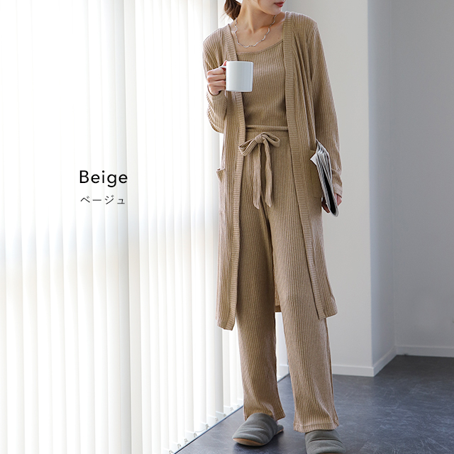 - タンクトップ&パンツ&ロングカーディガンの3点セット。ベージュ(ココア)を購入。サイズはXXL。ルームウエアとありますが、ワンマイル程度ならお出かけして行ける感じのお洒落なものでした。春、夏、初秋と着...