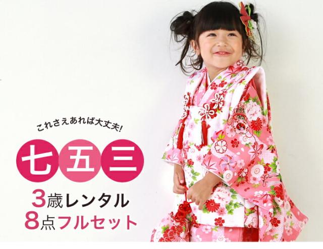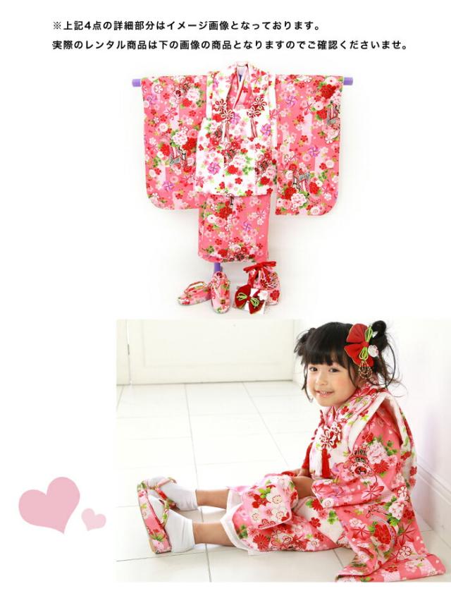 七五三 3歳 レンタル 女の子 被布着物8点セット「ピンク地に御所車と鼓(被布:白)」
