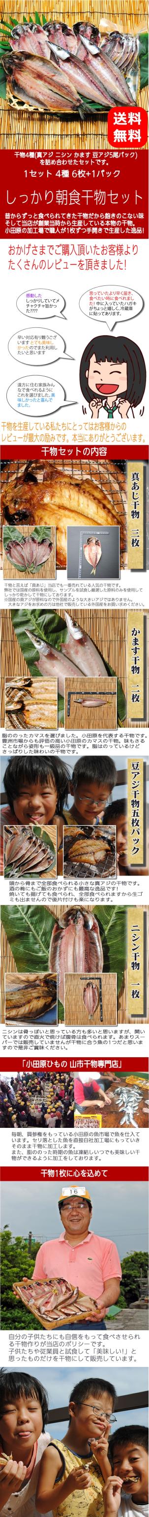 【内容】真あじ干物3枚、かます干物2枚、ニシン干物1枚、豆アジ干物5尾1パック