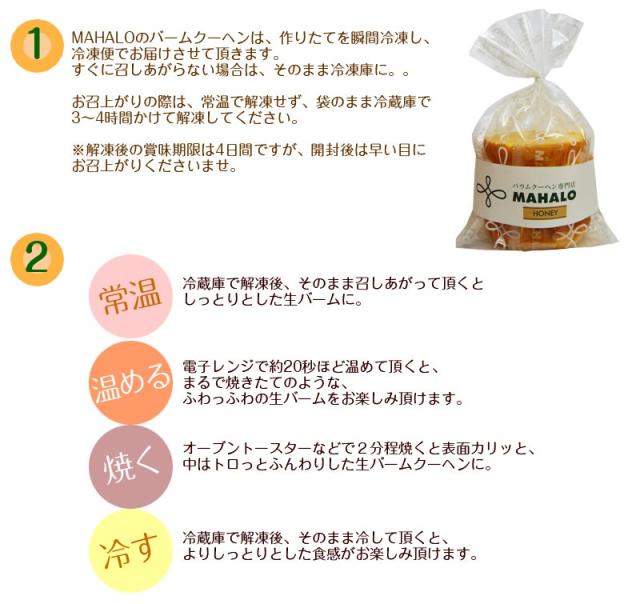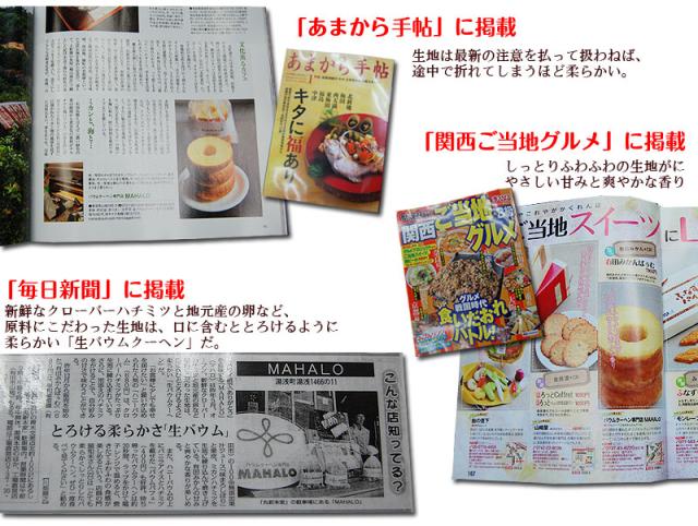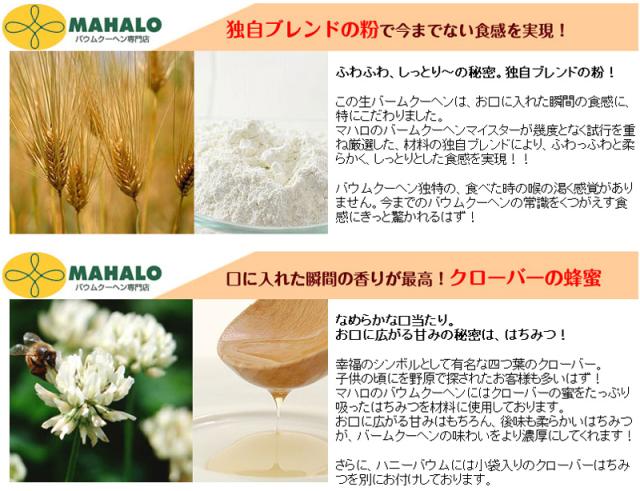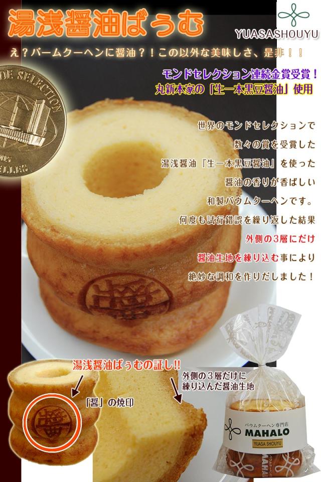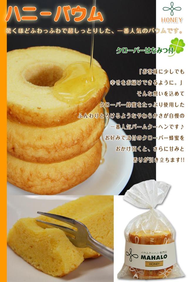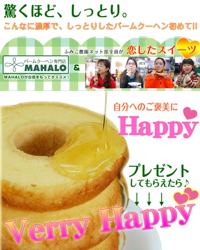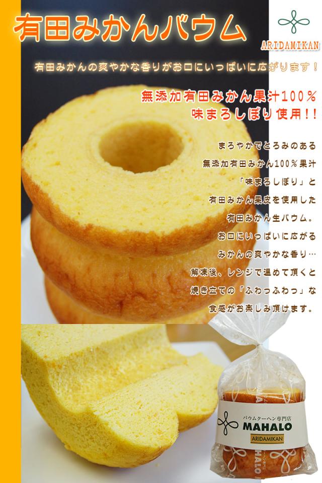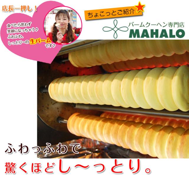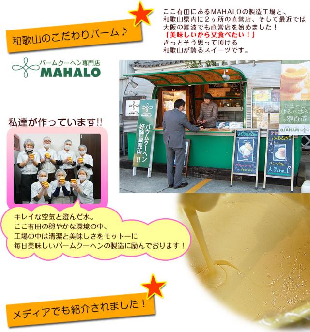 各種メディアでも紹介された、和歌山の絶品バームクーヘンです。 新聞や雑誌でも紹介されるようになった、MAHALO(マハロ)のバームクーヘン。 ![]() ![]() ![]() ハニーバームクーヘン(クローバーはちみつ付き) 一番プレーンな味わいのこのハニーバームクーヘンが、何と言っても一番人気!! また、解凍後電子レンジで約20秒ほど温めて頂くと、焼きたてのような ![]() 湯浅醤油バームクーヘン え?バームクーヘンに湯浅醤油?! そのまま召しあがって頂いてもふわっふわで美味ですが、 ![]() チーズバームクーヘン フランス産のクリームチーズをたっぷり使用した ![]() チョコレートバームクーヘン お菓子の国オランダ産のココアパウダーとチョコレートをたっぷり使用した そのまま召しあがって頂いてもふわっふわの美味しさですが、 ![]() 有田みかんバームクーヘン まろやかで とろみのある、特別な100%有田みかん果汁「味まろしぼり」だけを使用し、 本当にしっとり、ふっわふわ!喉が乾かない不思議な食感のバームクーヘン。