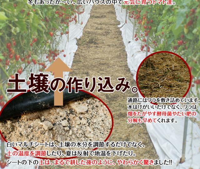 農薬や化学肥料に頼らず、堆肥などの有機物の施用により地力の維持、向上に努めるともに、施肥法の見直し等により化学肥料の施用量を削減し、慣行の収量・品質を確保し、熟成された土を育てる事によって、安心安全でありながら、すばらしく美味しいミニトマト、アイコを育てています!