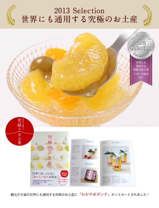 和歌山県産の梅の甘露煮、温州みかん、八朔(ハッサク)、あら川の桃の若桃をジュレにそっと閉じ込めました。フルーツ王国、和歌山ならではの、やさしい甘みとフルーツ本来の香りをご賞味頂ける逸品です。和歌山県は梅、みかんをはじめとして全国的に生産量がトップクラスの果物がいくつもあります。このことを広くPRするために県食品流通課が梅と果物を使ったフルーツポンチを和歌山名物にしようとしたのが始まりです。そして今回、ふみこ農園で初めて和歌山県との連携により、全国に向けて展開させて頂ける、わかやまポンチが出来上がりました!