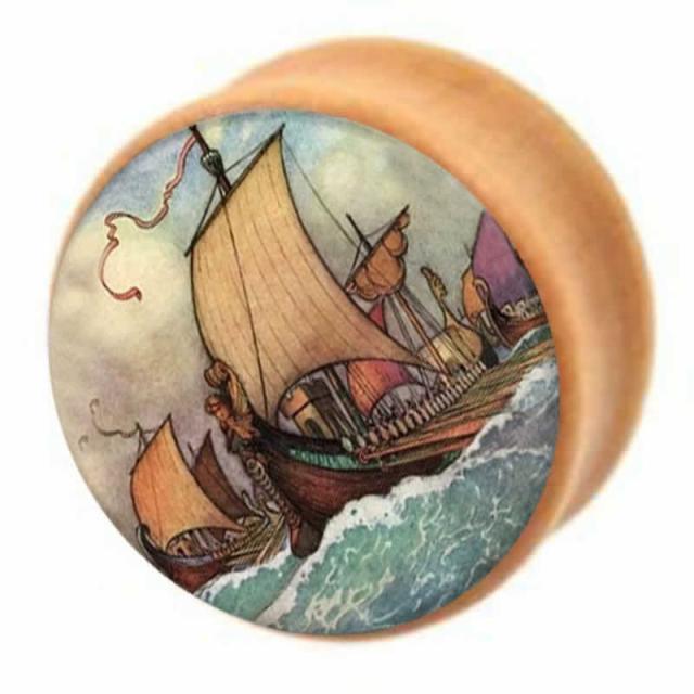 木製のプラグ型ボディピアスに海賊船をデザインしたおしゃれなオーガニックピアス。手作りされたハンドメイドの木製プラグに絵画のような船のデザインがおしゃれに決まる。両側が広がったダブルフレア型のプラグはキャッチもなく見た目もすっきり。メンズでもレディースでも使えるボディーパイスはペアルックやプレゼントにもおすすめ。金属アレルギーのない天然素材ボディピアス。