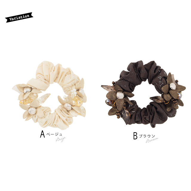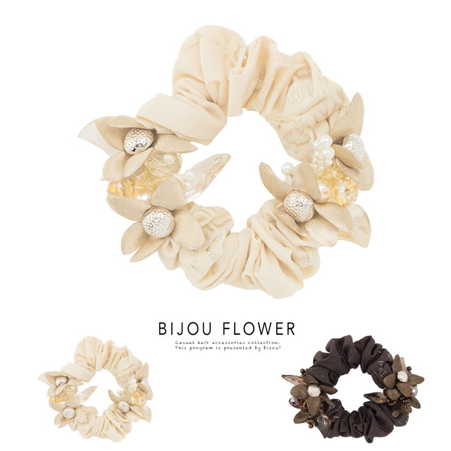 【フラワーとビジューの組み合せが上品な大人っぽいシュシュ】スモーキーカラー/カジュアル/ヘアアレンジ/髪留め/ヘアアクセサリー