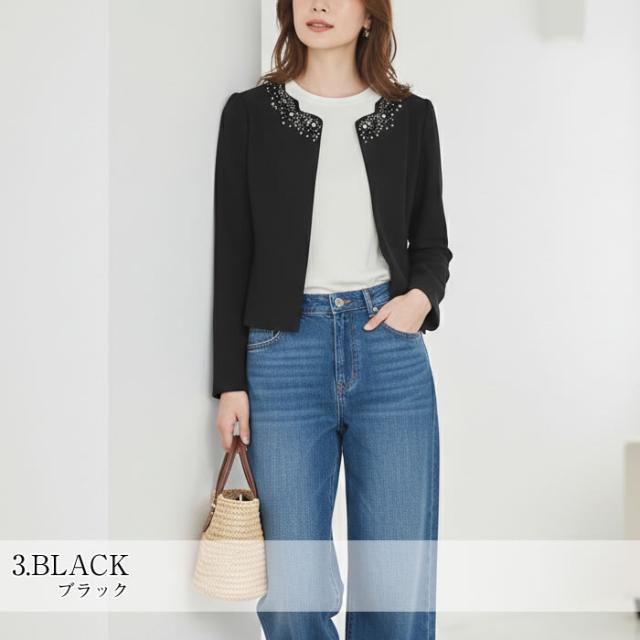 首元のパールとストーンが上品なトップスはおるだけでエレガントな女性に。