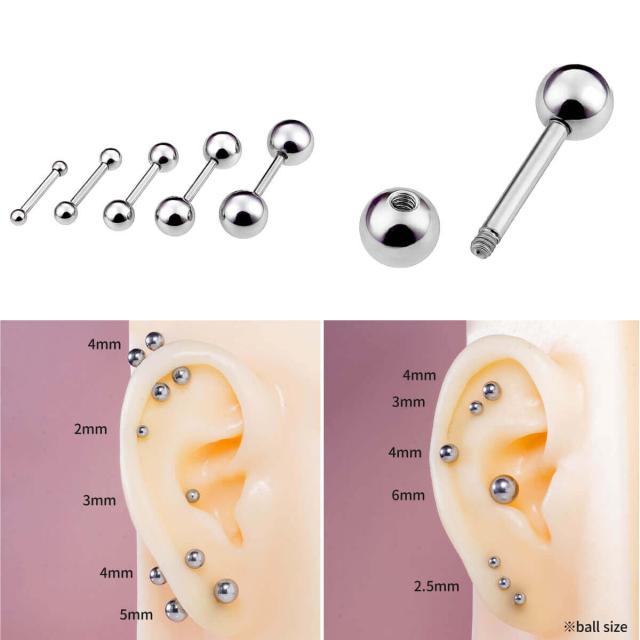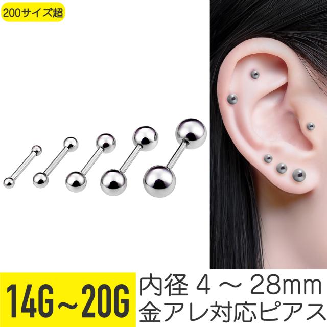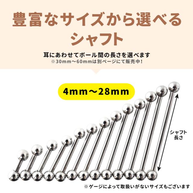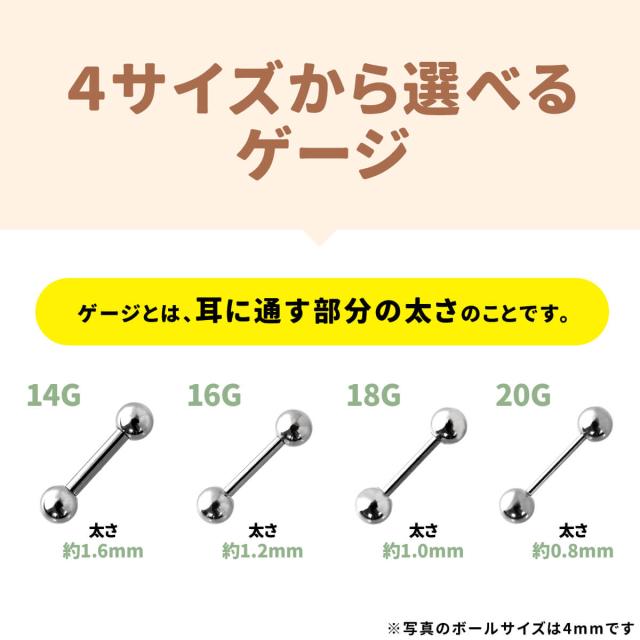 太さ14G,16G,18G,20G シャフト4mm〜28mm ボールサイズ2mm〜6mmのストレートバーベルです。