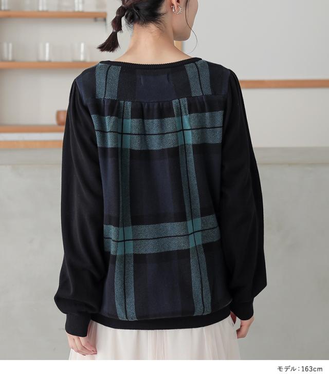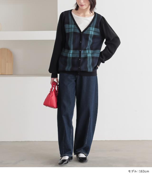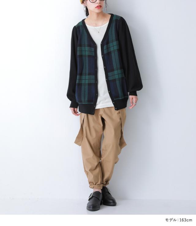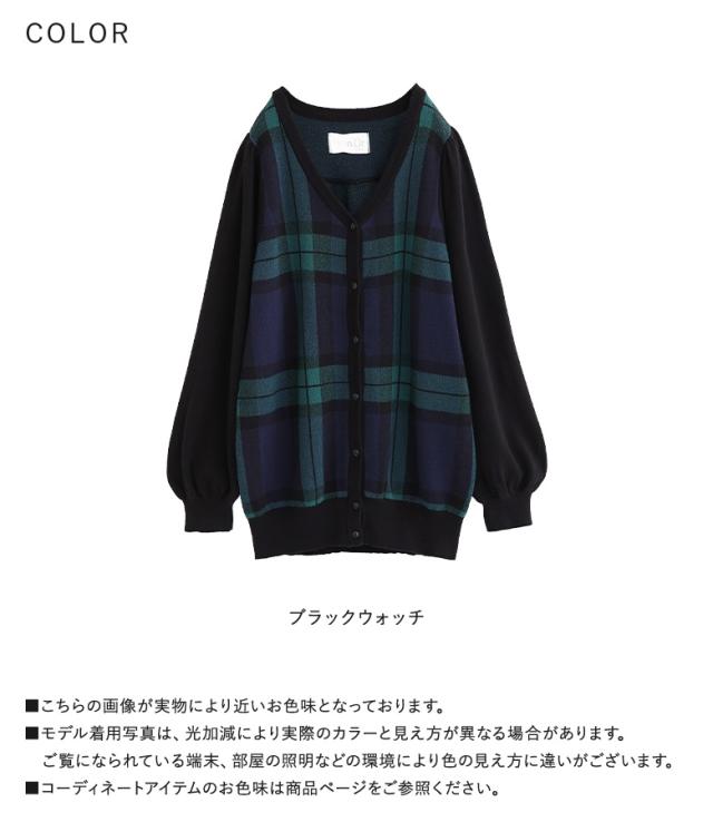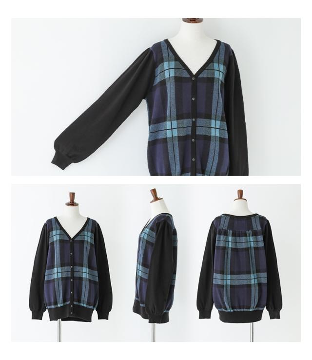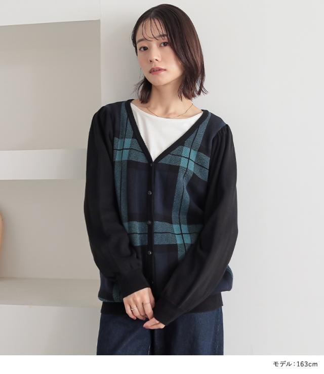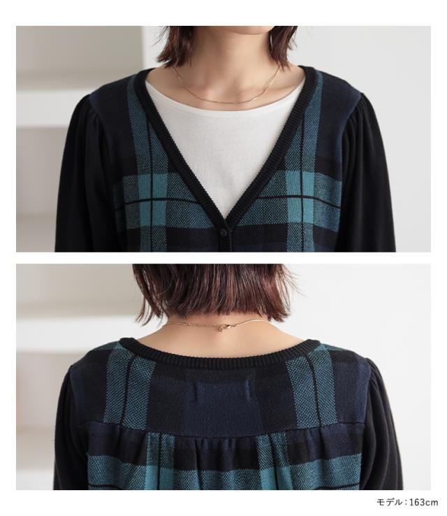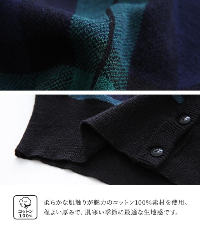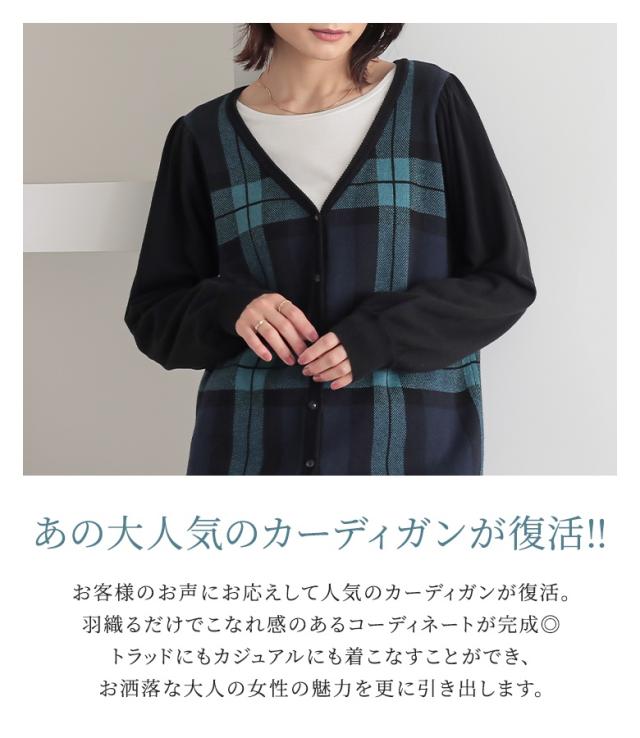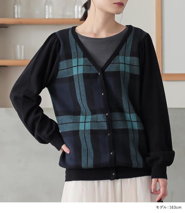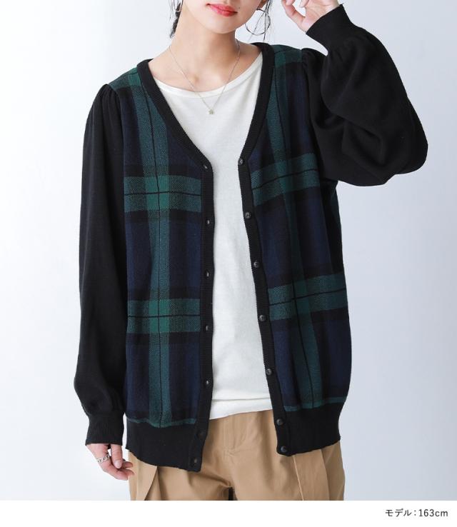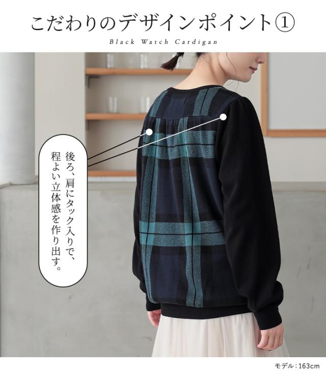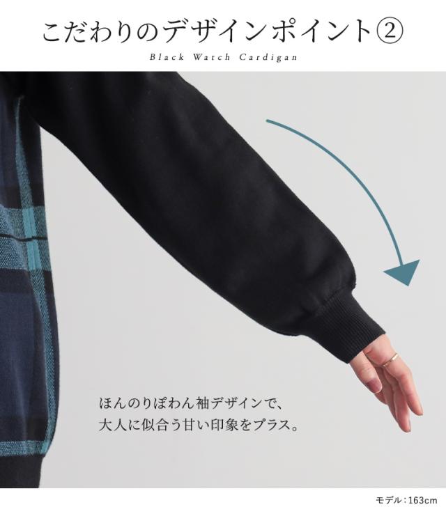 『ブラックウォッチカーディガン』 【メール便不可】【20】[カーディガン レディース 秋 冬 トップス ニット セーター チェック柄 ブラックウォッチ 羽織り 長袖 ぽわん袖 コットン100% 綿100% ゆったり ニットカーディガン han2050]
