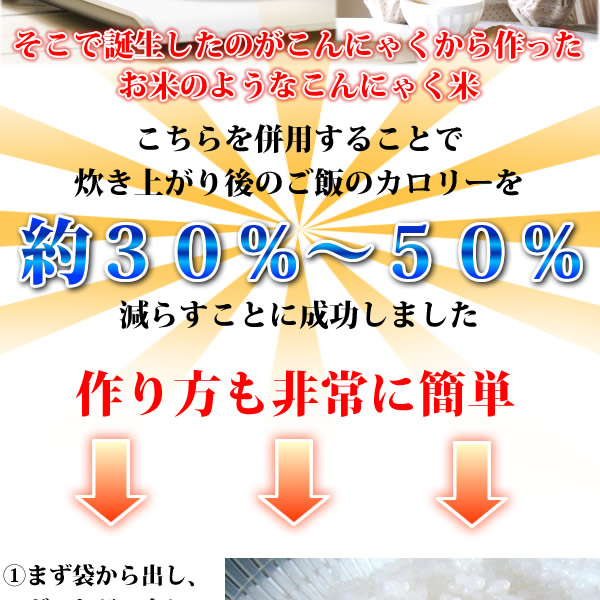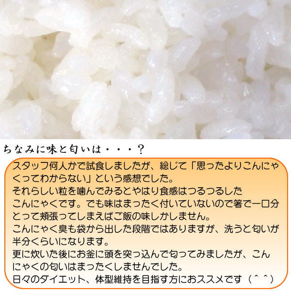 | 商品の説明 お米を2合(約300g)にこんにゃく米(150g)を入れてください。 こんにゃく米はノンカロリーですので出来上がりのご飯は通常のご飯と比べて約2/3のカロリーとなります。 したがいまして、ダイエットやカロリー制限のお役に立てると思われます。 ※製造からの賞味期限は4ヶ月間で、お客様へはおおよそ3ヶ月前後の賞味期限の商品がお手元に届きます。 |