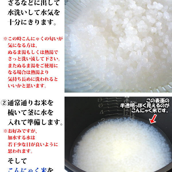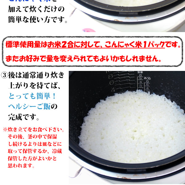 このこんにゃく米は、お米に混ぜて炊くだけの簡単な調理方法で使用できます。