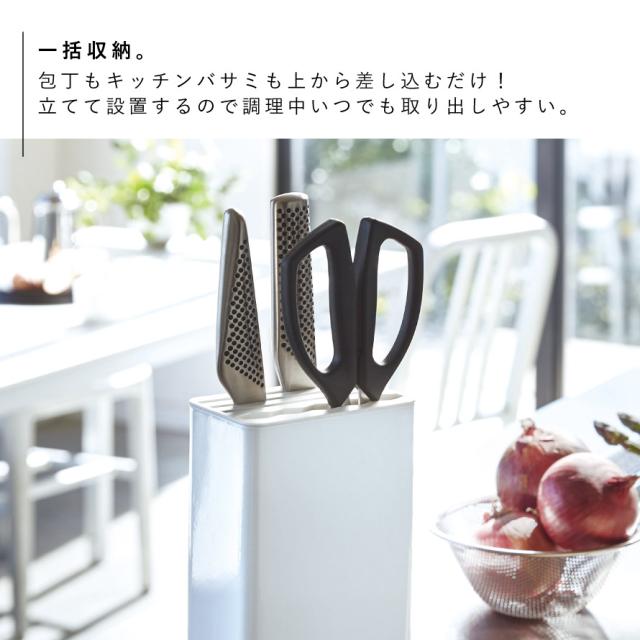 包丁とキッチンバサミを一括収納!倒れにくい設計の刃物スタンド。包丁もキッチンバサミも上から差し込むだけ!しっかりホールドしてくれるから安心。包丁は3本収納可能。ハサミは厚み約10-15mmのものが入ります。