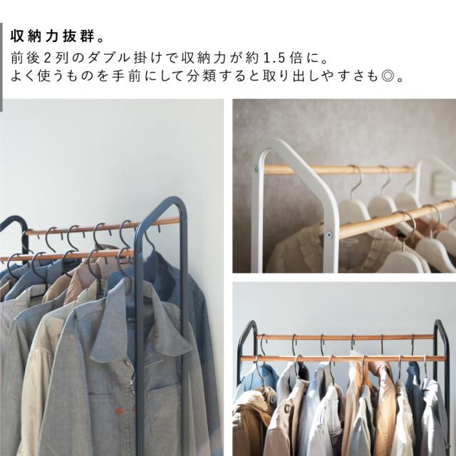 前後2列のダブル掛けで収納力が約1.5倍に。手前と後ろのバーで、季節に合わせてよく使うものなどを分類しても。