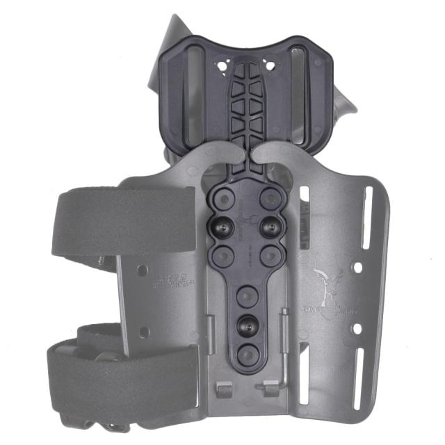 ホルスターを取り付けた際、脚や装備に干渉しないよう設計されています。Safariland製ホルスターの裏側のネジ間隔は全機種共通ですので、ヒップホルスター / レッグホルスターであればどのモデルでも使用OK。