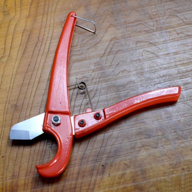 樹脂製や塩ビ製のパイプを切断する際に使用する、パイプカッター。カッターの受け部分が直径35mm程度の円弧の形をしており、しっかりホールドして切ることができます。