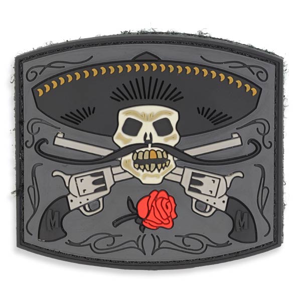 裏面がベルクロオスになって脱着が容易になマックスペディションのパッチ エル グアポ。メキシコな帽子のソンブレロを被ったヒゲを生やした骸骨と、交差する銃が凹凸のあるラバーにがかれています。