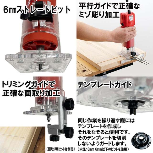 | キャリングケース・トリミングガイド・ストレートビット6mm・スパナ2本・平行定規・テンプレートガイド。 |