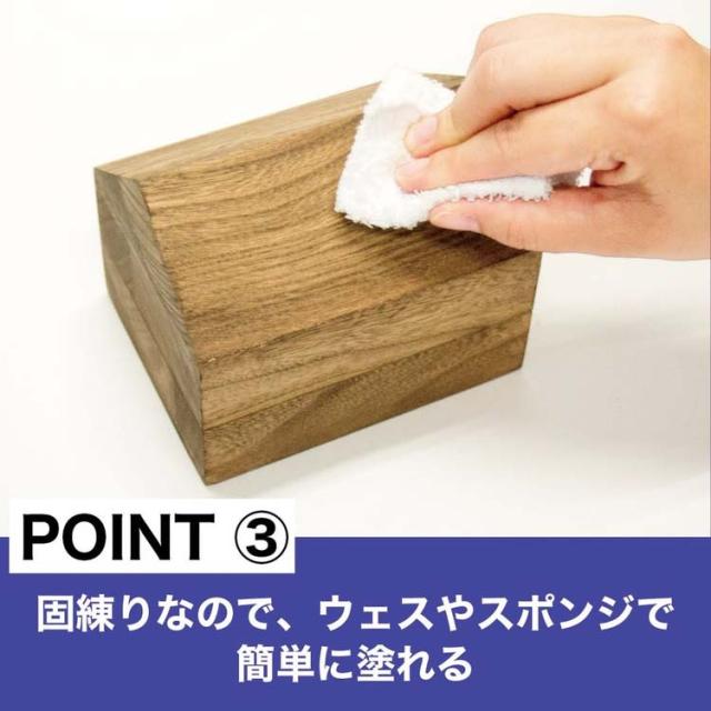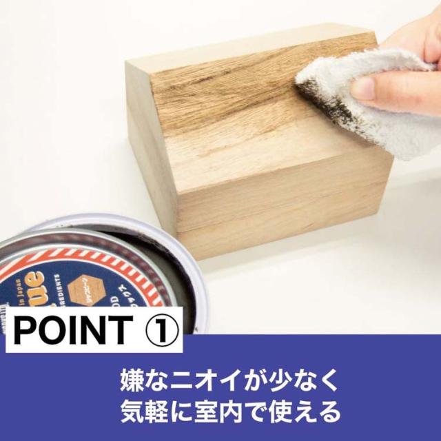 天然素材のミツロウを使用した、人に優しいワックスです。天然素材のミツロウが主な原料で、溶剤は臭気が少なく毒性の低いノルマルパラフィンを使用しています。木の保護と着色を同時に行え、嫌なにおいが少なく気軽に使えます。固練りなので、ウエスやスポンジで簡単に塗ることができます。手や塗装箇所以外を汚さず使用できます。ワックスの伸びもよく綺麗に簡単に仕上げができ、塗装後の色移り、ベタつきが少なく用途が広がります。