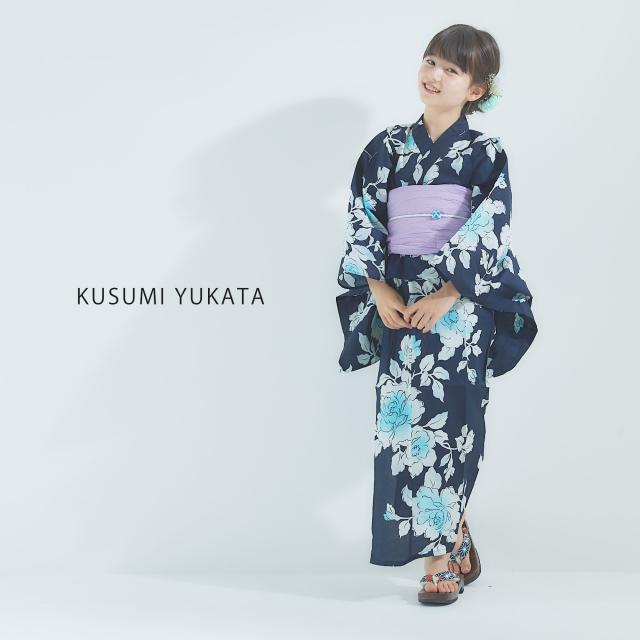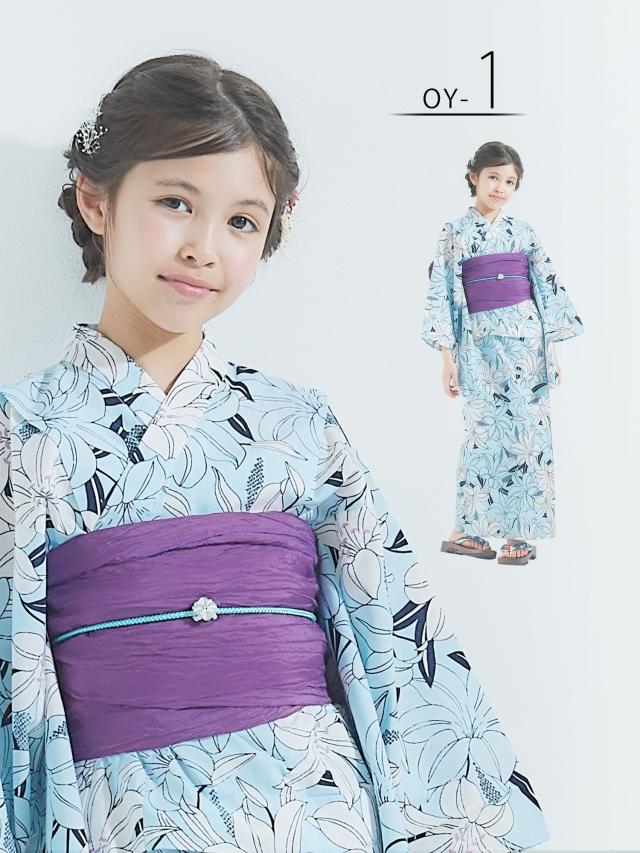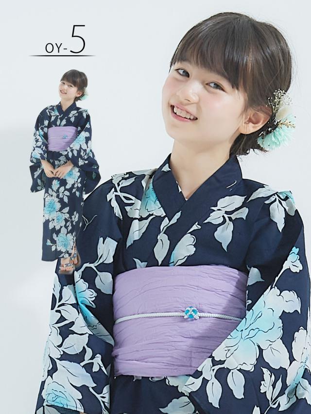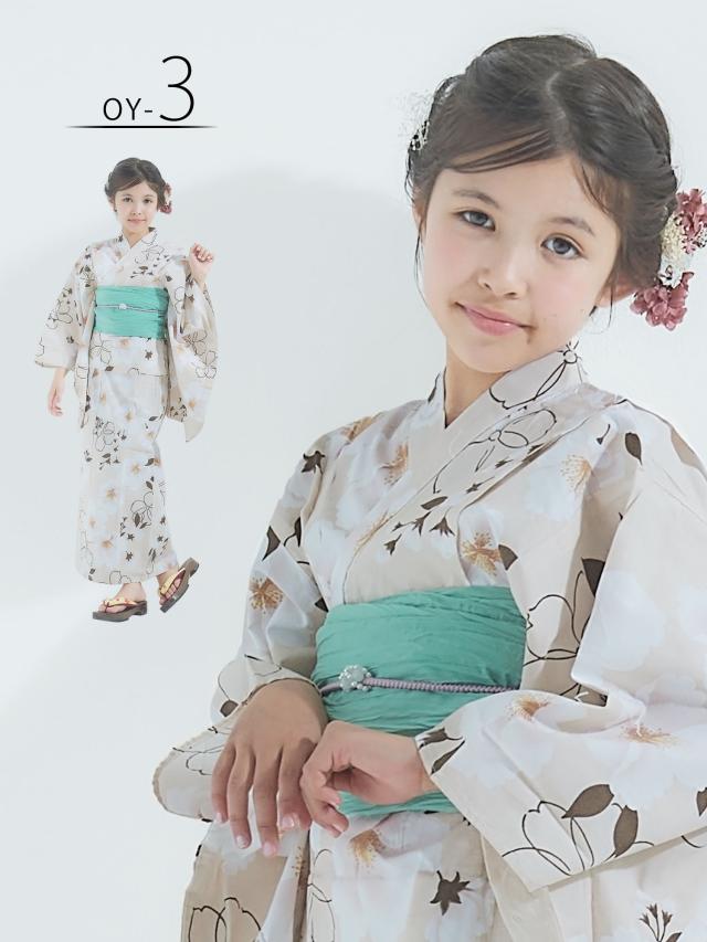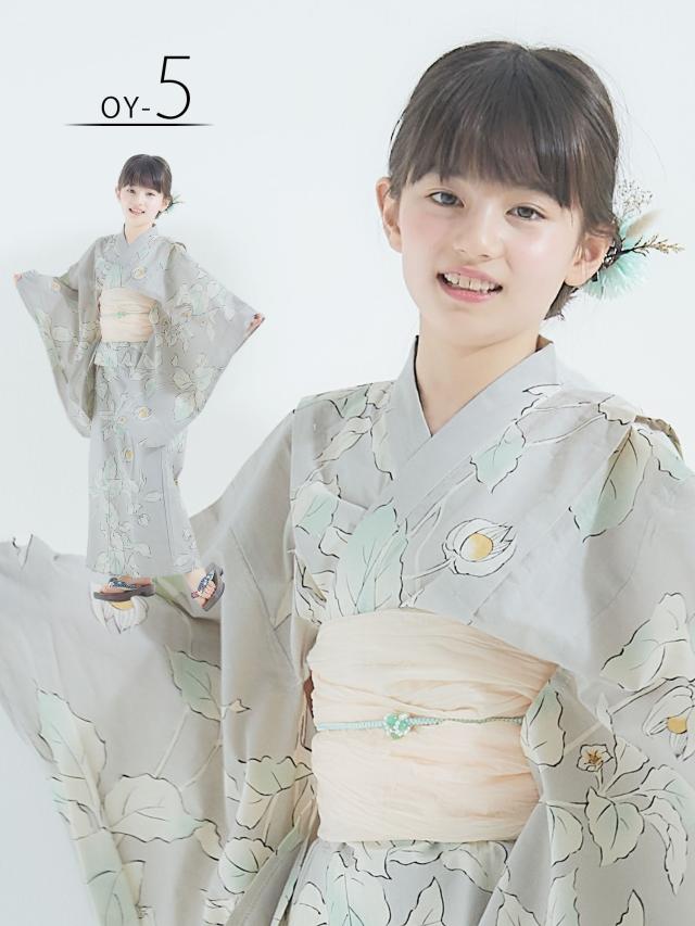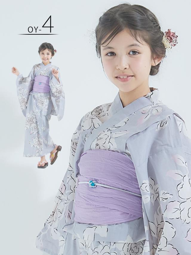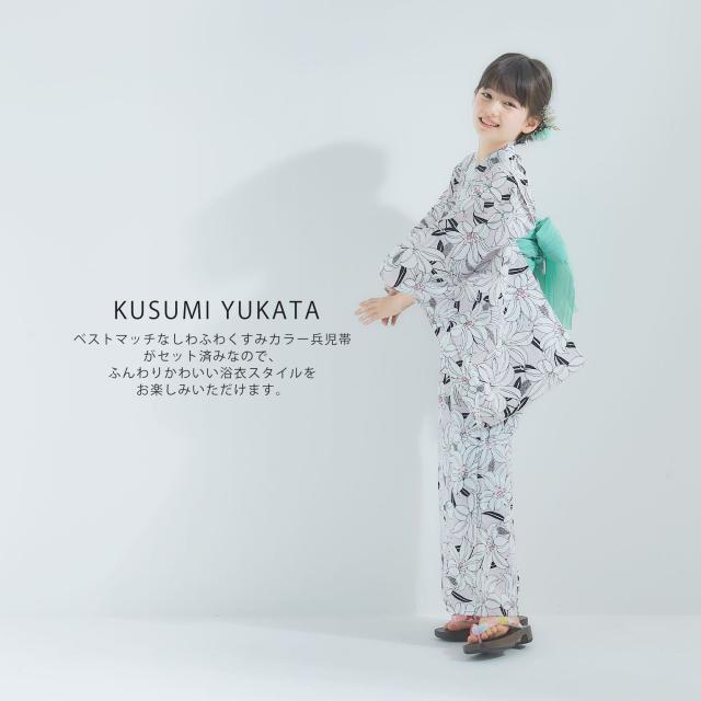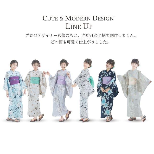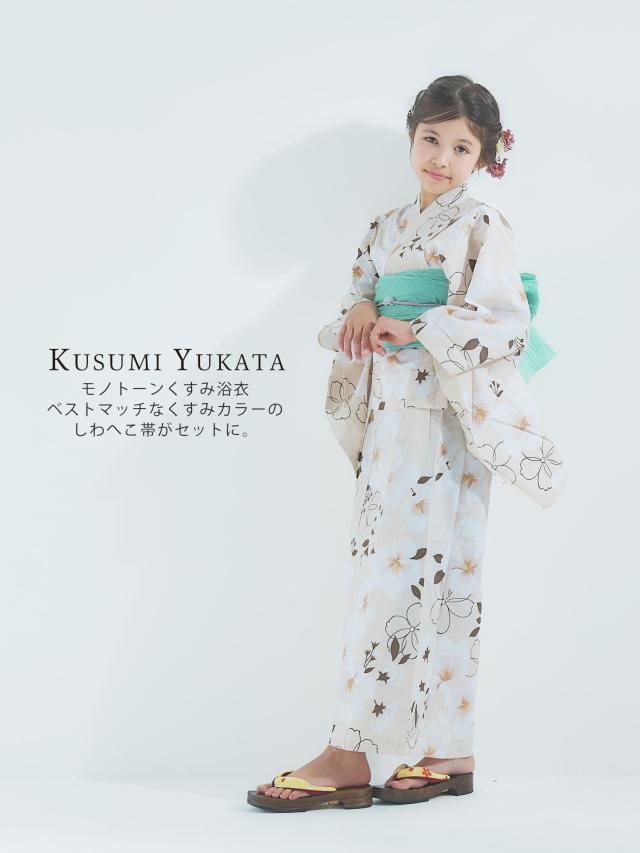 浴衣 子供 女の子 3点セット 選べる2色 6サイズ 110cm 120cm 130cmキッズ しわへこ帯がセット 兵児帯 下駄 ニュアンスカラー トレンド くすみカラー モノトーン 花柄 モダン 綿 送料無料 子ども服 青 ピンク くすみピンク グレイ ゴールド