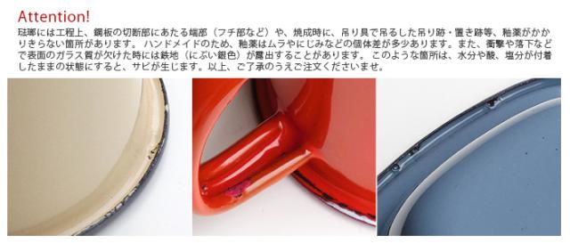 ■ご注意…釉薬は、1つ1つ手作業で塗り付けを行なうためムラやにじみなどに個体差があります/切断面である端部分には、釉薬がかかりにくく黒い筋が見られますが、使用には影響がありません/琺瑯製品は、表面がガラス質のため、衛生面で優れる反面、強い衝撃などで割れることがありますので取り扱いにはご注意ください/水を入れたまま放置しますと、錆の原因になりますので、おやめください