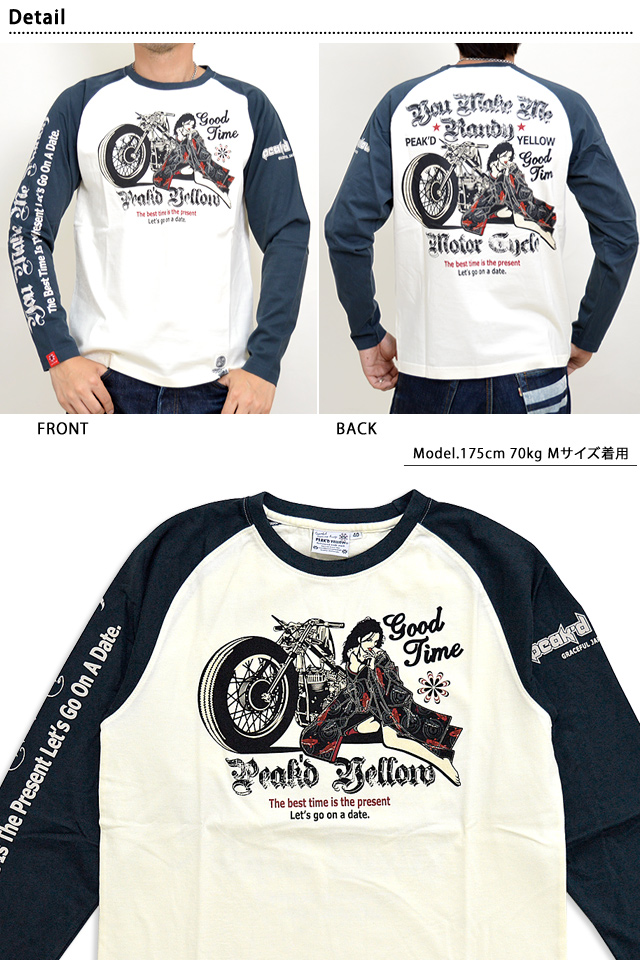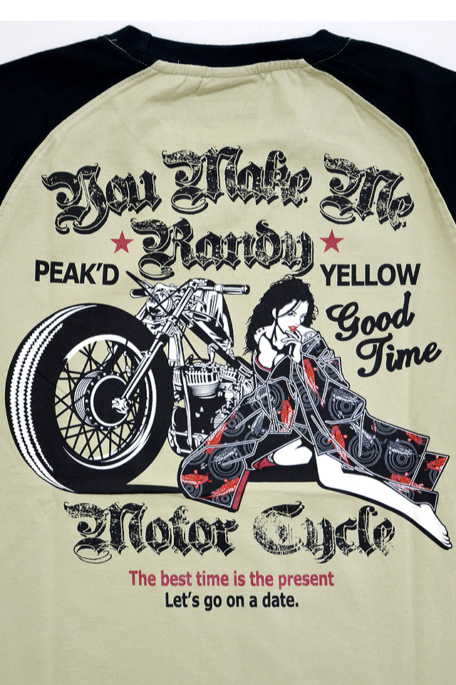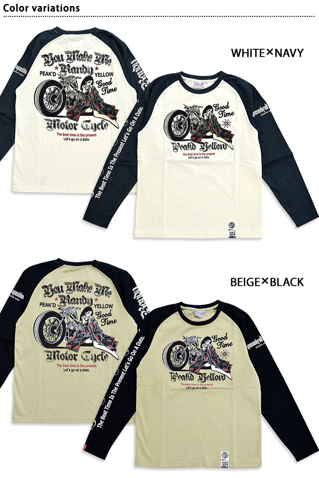 「トンガった日本人」をブランドネーミングに掲げ、オリエンタルビューティーの世界観を作品に封じ込めるピークドイエローから「BIKE長袖Tシャツ(PYLT-204)」のご紹介です! バイクに寄り添う姿が色気たっぷりなデザインの長袖Tシャツが登場! フロントバック共に、中央には愛車のバイクに体を委ねる姉御の姿が描かれています。 カラーは全4色。 生地には綿100%の、よれにくいタフなものを採用。 | ||||||||||||||||||||||||