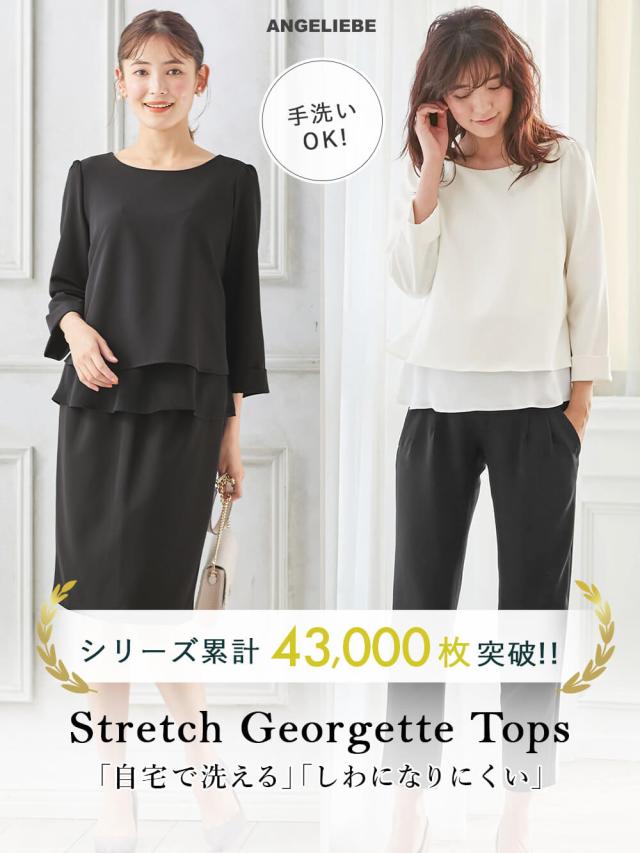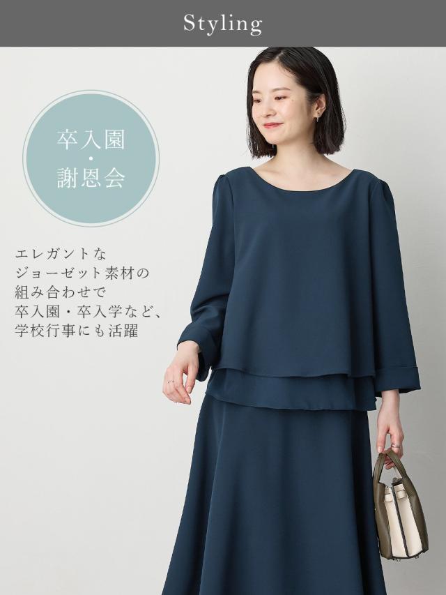 袖のギャザーと折り返しデザインがきちんと感を演出。裾のレイヤード部分には透けにくいジョーゼット素材を使用しているので、マタニティボトムのリブ隠しになってくれます。サイドスリット入りで、お腹が大きくなってもすっきりシルエットのまま着れて、産後は授乳がしやすい便利な1枚です。同素材のボトムを合わせればセットアップスタイルも。