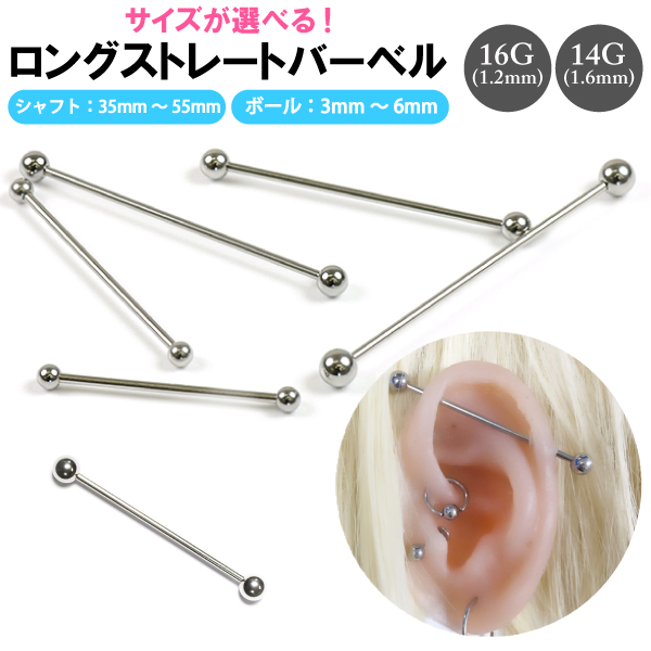 【メール便対応】ボディピアス ロングストレートバーベル 16GA(1.2mm) 14G(1.6mm) 35mm〜55mm サージカルステンレス316L 定番 ボディーピアス 軟骨┃