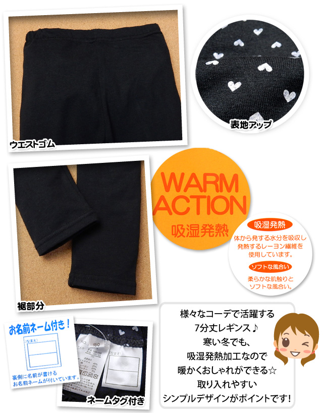 【送料無料】子供服 女の子 7分丈 レギンス ボトム 吸湿発熱 ネームタグ 無地 ハート 女児 ジュニア 【メール便対応】