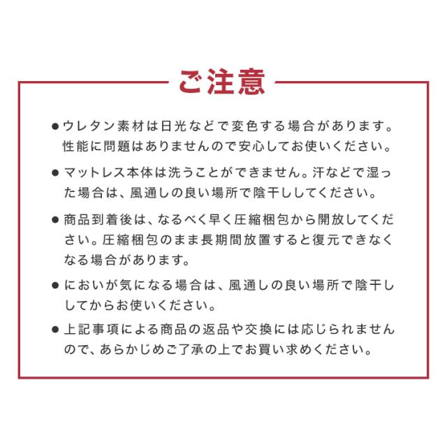 | 注意事項 | ・圧縮梱包されたままの状態で長期間保管した場合、マットレスが復元できなくなってしまいます。商品到着後、すぐ圧縮から開放をして頂くようにお願いいたします。 ・マットレスは約1〜2日で復元します。気温や温度により3〜14日かかる場合もあります。 ・製品の臭いが気になりましたら、風通しの良いところで脱臭してください。この臭いは素材のウレタンによるもので無害です。臭いに敏感な方は十分ご検討の上、ご購入をお願いいたします。 ・マットの硬さは温度によって変わってきます。また、硬さの感じ方には個人差があります。 ・カバーは取り外して洗濯ができますが、マットレス本体は洗濯しないでください。 ・生産ロットによって復元率・ニュートンに差異が生じる場合があります。 ・商品は、モニターによって色合いが異なって見える場合があります。 ・仕様・デザインは改良のため予告なく変更することがあります。 |
