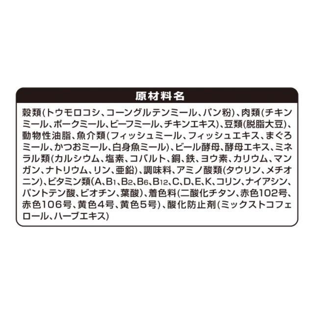 | 穀類(トウモロコシ、コーングルテンミール、パン粉)、肉類(チキンミール、ポークミール、ビーフミール、チキンエキス)、豆類(脱脂大豆)、動物性油脂、魚介類(フィッシュミール、フィッシュエキス、まぐろミール、かつおミール、白身魚ミール)、ビール酵母、酵母エキス、ミネラル類(カルシウム、塩素、コバルト、銅、鉄、ヨウ素、カリウム、マンガン、ナトリウム、リン、亜鉛)、調味料、アミノ酸類(タウリン、メチオニン)、ビタミン類(A、B1、B2、B6、B12、C、D、E、K、コリン、ナイアシン、パントテン酸、ビオチン、葉酸)、着色料(二酸化チタン、赤色102号、赤色106号、黄色4号、黄色5号)、酸化防止剤(ミックストコフェロール、ハーブエキス) |